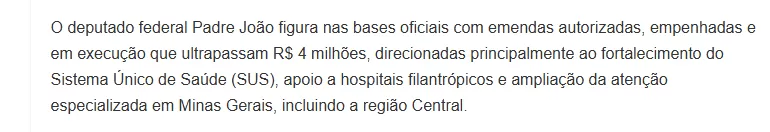 O levantamento destaca que o deputado Padre João figura entre os parlamentares de Minas Gerais com mais de R$ 4 milhões em emendas autorizadas, empenhadas e em execução. A maior parte dos valores foi direcionada ao fortalecimento do Sistema Único de Saúde (SUS), ao apoio a hospitais filantrópicos e à ampliação da atenção especializada.