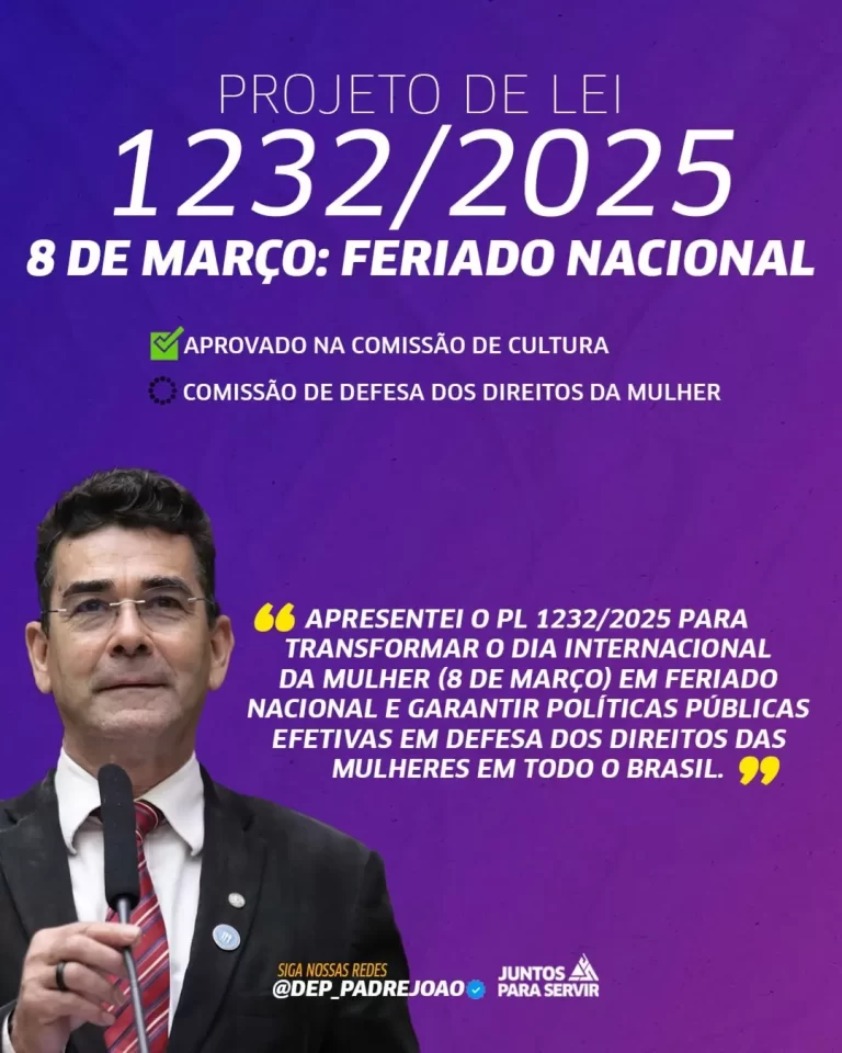 Feriado no dia 8 de março – Dia Internacional da Mulher Foi aprovado na Comissão de Cultura da Câmara dos Deputados o projeto de lei 1232/2025, que torna o dia