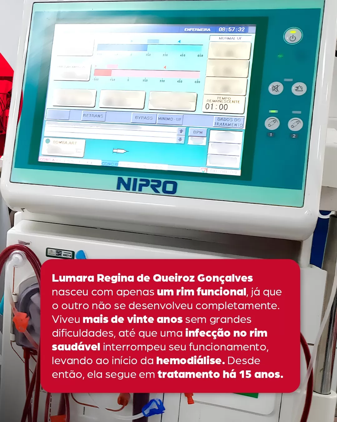Lumara nasceu com um rim atrofiado e viveu normalmente até os 22 anos, quando o rim funcional sofreu uma infecção grave e deixou de funcionar. Desde então, depende da hemodiálise para sobreviver e manter a qualidade de vida, enquanto aguarda um transplante de rim na fila por um doador compatível.