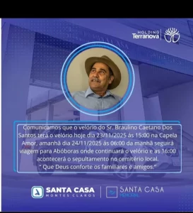 Velório: Início em 23/11/2025, às 15h, na Capela Amor, Montes Claros.