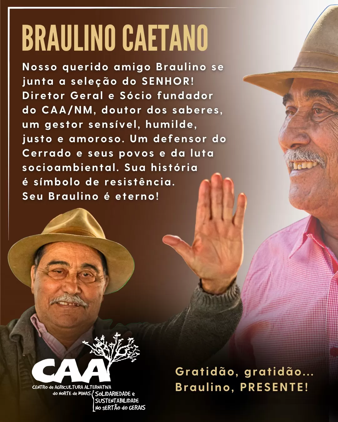 Diretor Geral e sócio-fundador do Centro de Agricultura Alternativa do Norte de Minas (CAA/NM), Braulino dedicou mais de cinco décadas à construção de um território mais justo, sustentável e solidário. Homem de sabedoria, humildade e firmeza, foi reconhecido como liderança das causas consideradas impossíveis, sempre ao lado das populações tradicionais — geraizeiras, quilombolas, indígenas e catringeiras — e das famílias mais vulneráveis.