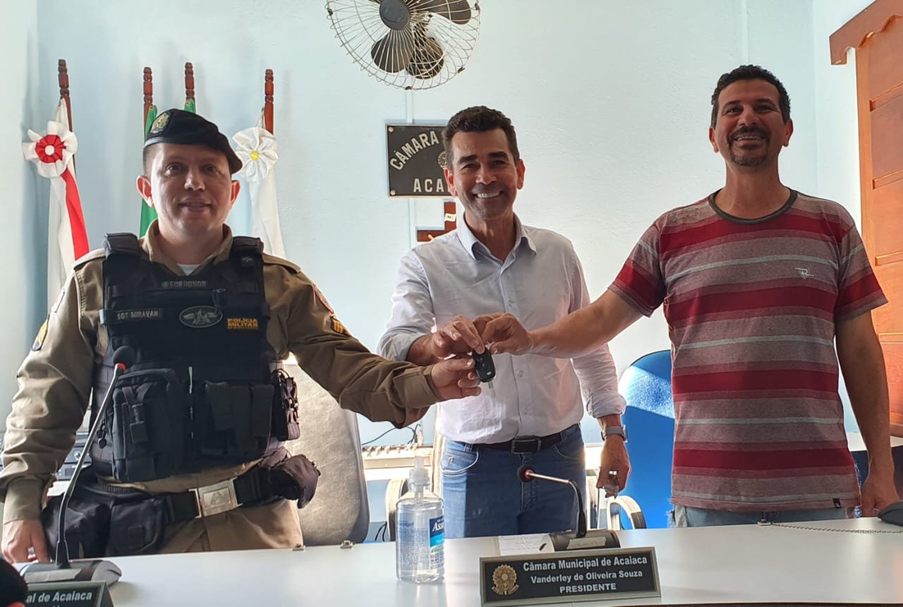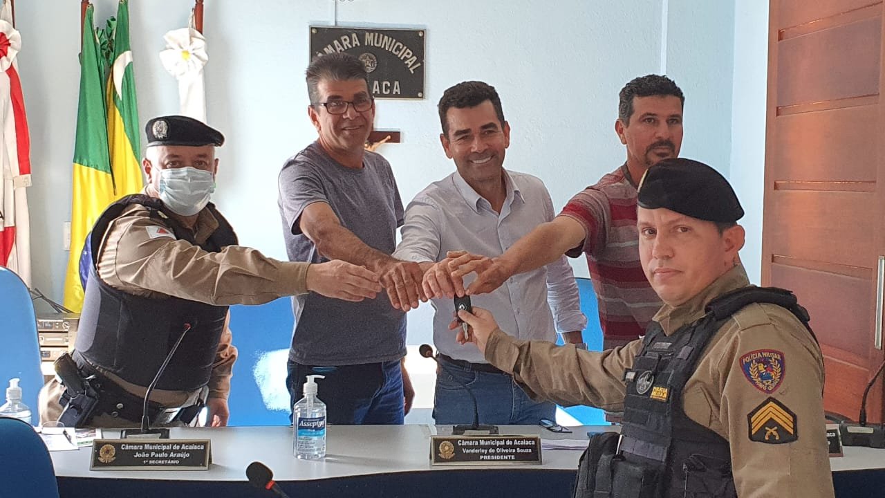 Nesta quinta-feira (23/06), estivemos na cidade de Acaiaca para entregar uma viatura para a Polícia Militar do município. O cerimonial de entrega foi realizado na Câmara de Vereadores da cidade e contou com a presença do prefeito Luiz Carlos Faustino (Lulu), do presidente da Câmara Wanderley (Leley), dos vereadores João Paulo e Eliseyev e o ex-vereador Regino; do comandante da 21ª Cia. Independente da PM de Ponte Nova, tenente-coronel Wanderson Diniz.
